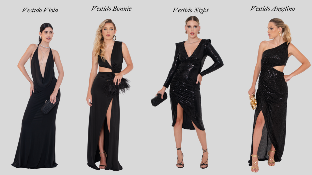 Iniciamos essa seleção com vestidos que unem glamour, atitude e sofisticação. . O Vestido Viola traz toda a sua ousadia com decote profundo e caimento fluido. Já o Vestido Bonnie é todo moderno, com recortes e detalhes que fazem toda a diferença. O Vestido Night é aquele clássico com brilho, para momentos especiais. E finalizando essa primeira seleção temos o Vestido Angelino, que é um look cheio de presença.