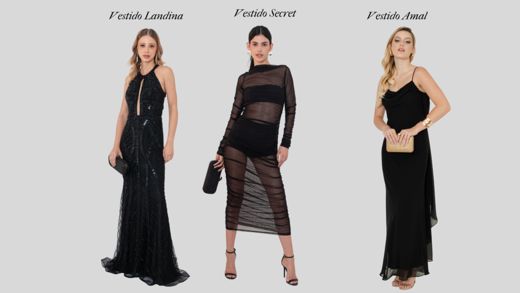 O nosso Vestido Landina é sofisticado e glamouroso, ideal para festas de gala. Já o Vestido Secret é ousado e cheio de atitude. E para finalizar temos o Vestido Amal, que um look atemporal, perfeito para quem busca leveza com elegância.