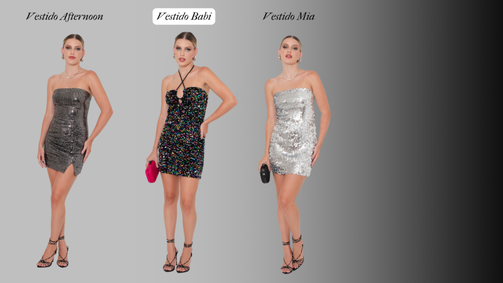 O nosso Vestido Afternoon é o clássico tom metalizado que ganha vida em um shape justo e elegante, perfeito para noites cheias de estilo. Já o Vestido Babi tem um toque de brilho e diversão! As aplicações coloridas e o decote halter transformam esse modelo em um destaque absoluto. E finalizando essa priemeira parte, temos o Vestido Mia. Prateado e poderoso, é o mini ideal para brilhar (literalmente) em qualquer ocasião.