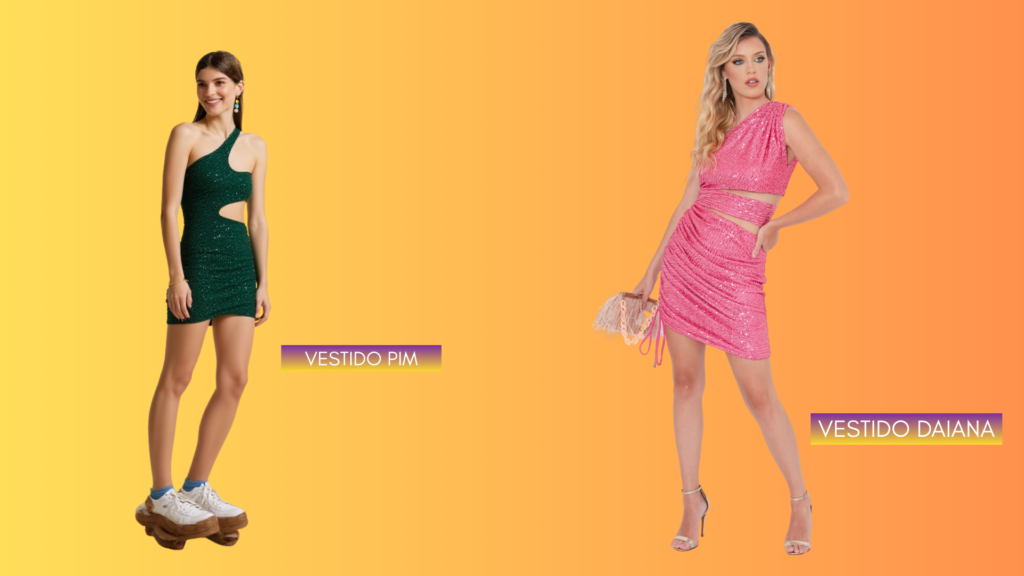 Durante o dia, o Vestido Pim e o Vestido Daiana funcionam muito bem. O Vestido Pim tem uma estética leve e atual. Por isso, é ideal para bloquinhos. Enquanto isso, o Vestido Daiana aposta no brilho. Assim, ele funciona para festas e eventos noturnos.
