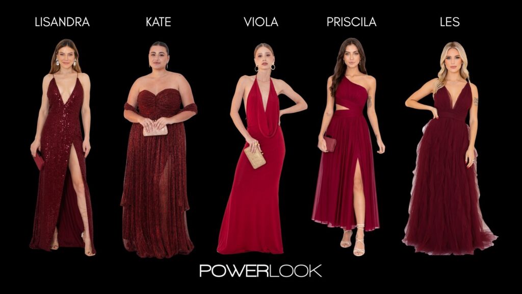 Começando pelo marsala, temos o vestido Lisandra, uma opção bem elegante com decote em V, fenda e costas abertas, perfeito para brilhar sem medo! O vestido Kate tem um brilho mais discreto e uma leve transparência que garante sensualidade sem abrir mão da elegância. Além disso, conta com uma faixa nas costas totalmente versátil, que pode ser usada de diversas formas.