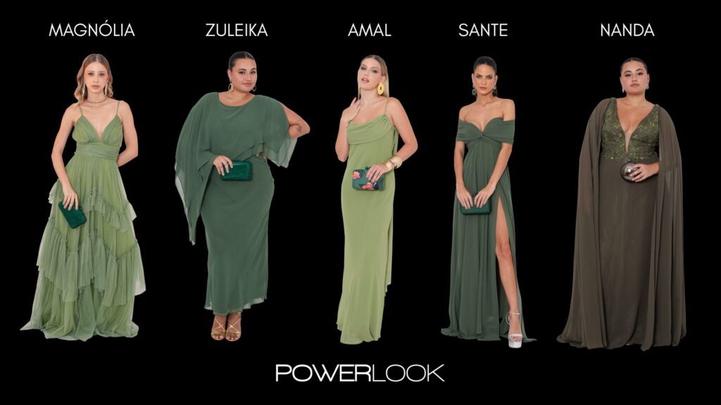 Seguindo com os tons de verde-oliva, temos o vestido Magnólia, com camadas de babados e alças finas, proporcionando um visual mais despojado e ousado. O vestido Zuleika é mais comportado, garantindo fluidez e contando com uma pequena capa assimétrica nos ombros, que acrescenta um charme ao look. O vestido Amal é o nosso queridinho! Possui drapeado no busto e costas vazadas, além de uma modelagem mais fluida, que garante conforto.